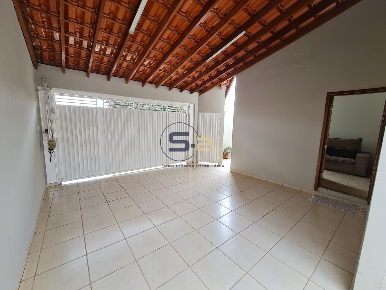 A garagem é coberta para 2 veículos, com espaço adicional no corredor lateral para mais carros, oferecendo praticidade e comodidade.
