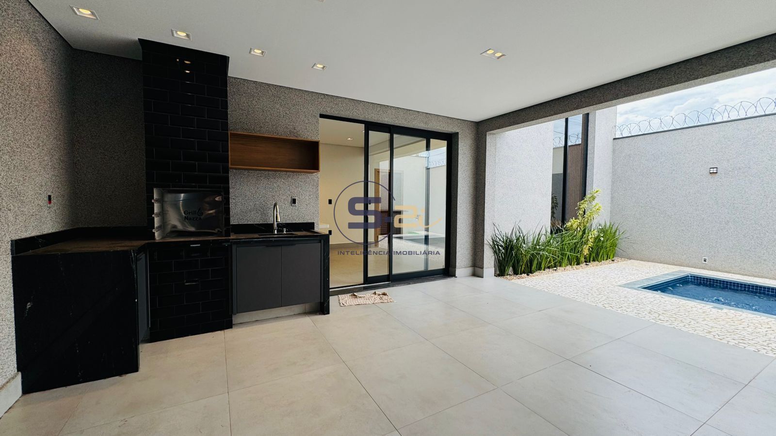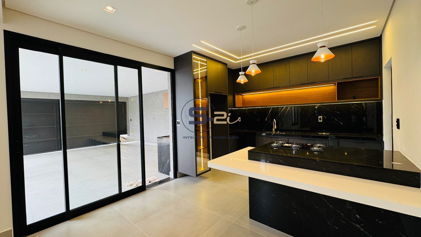 Construída em um terreno de 200 m², o imóvel possui 125 m² de área construída, com sala com pé-direito alto, iluminação indireta e excelente integração com a cozinha. A cozinha é ampla e funcional, equipada com bancadas nas paredes e ilha central com cooktop, além de ponto preparado para lava-louças.